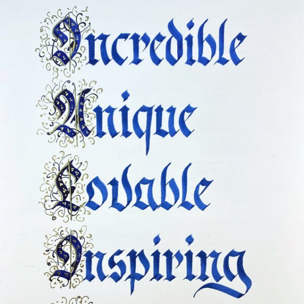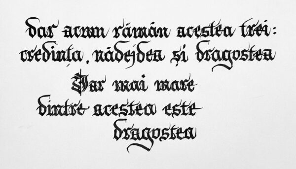 Curs de caligrafie istorică Gotic Fraktur, intensiv, pentru adulți, alcătuit din 6 lecții cu durata de 1,5 ore fiecare. La curs se studiază literele minuscule și majuscule din acest stil istoric longeviv și elegant, și se practica mici fragmente de text pe foi cu liniaturi speciale. Cursanții primesc materiale digitale pentru practica individuală.